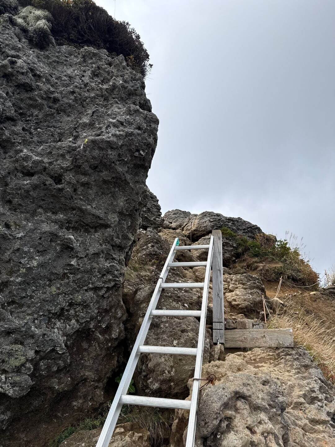 10分ほど歩くと岩峰直下の広場に着いた。岩峰にはアルミ製のはしごを使って取り付く。少しスリリングな地形なので慎重に足元を確認しながらよじ登っていくと、数分で眺望抜群の山頂に着いた。