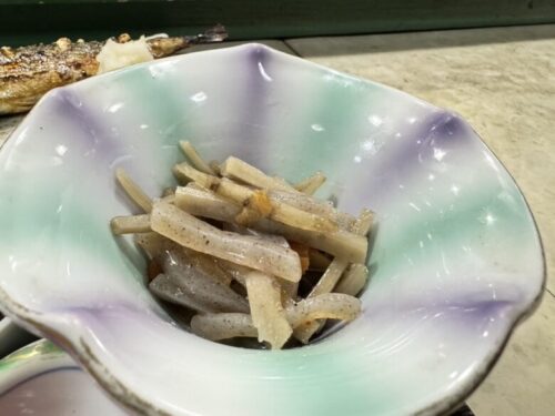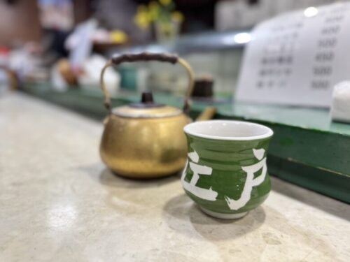 お茶が出てきたのですが、ヤカンで出てくるあたり、なんか知らんけど「やったー!」って気持ちになる。(←粋な店見つけたって意味) そして、湯呑みは ご存知、アガリ。(寿司屋で出る湯呑みですね) 至る所に寿司屋の名残が残ってます。