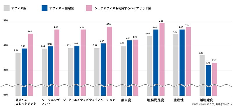 その結果、シェアオフィスも利用するハイブリッド型が生産性、組織へのコミットメント、ワークエンゲージメント、クリエイティビティ、イノベーション、集中度、職務満足度など各項目で高スコアを記録した。双方の変数には相関関係が確認された。