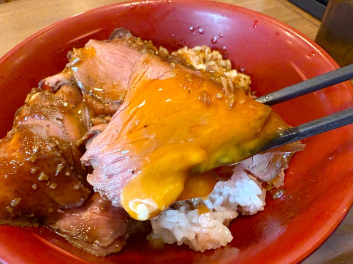 で、注文からほどなくして現れた『メガローストビーフ丼』はというと、うむ、メガである。肉はビッシリと敷き詰められており、ニンニクを使用したという醤油ダレもツヤツヤしちゃって実にウマそうだ。