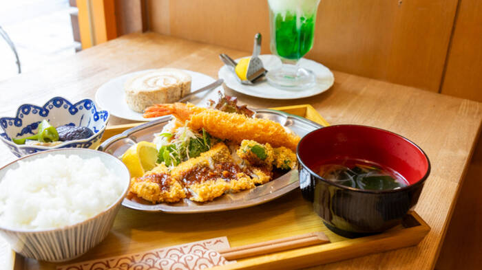 刺し身で食べられるほど新鮮なネタをフライにした『フライ定食』もあなどることなかれ。この厚み、この食感は、魚料理が自慢の同店だからこそ出せるものです。衣はサクッと軽やか、中はふっくらジューシーで、箸を入れた瞬間にじゅわっと魚のうま味があふれ出します。