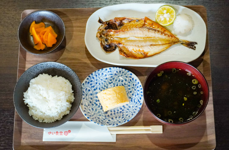 アジの開きがメインの『焼き魚定食』には、一口サイズの出汁巻き玉子が添えられ、朝からしっかり満足できる内容。脂のり抜群の大きなアジの開きは、注文が入ってから丁寧に焼き上げてもらえるので、香ばしい香りとふっくらとした身の食感を熱々のまま堪能できます。