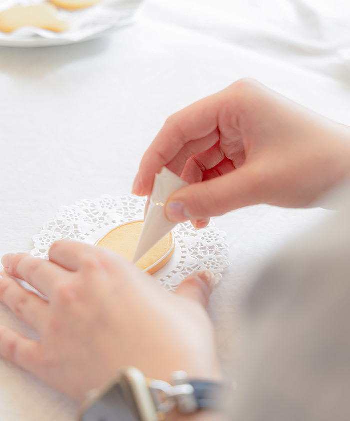 小山さん:「BASICコース」は全6回のレッスンを通して、生徒さんのご自宅でもアイシングクッキーをつくれるようになることを目指しています。第1回でアイシングのクリームのつくり方を、第2回では土台のクッキーのつくり方を教えています。最初はかなり地味ですが(笑)、アイシングクッキーをつくるには大事な工程なので、丁寧に教えています。