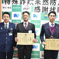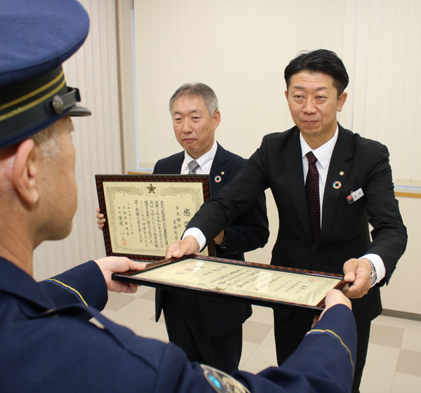 三重県警名張署は12月2日、投資詐欺の被害拡大を防いだとして、百五銀行名張支店(名張市夏見)の寺本尚史次長(48)と同支店に署長感謝状を贈った。