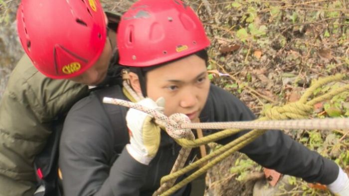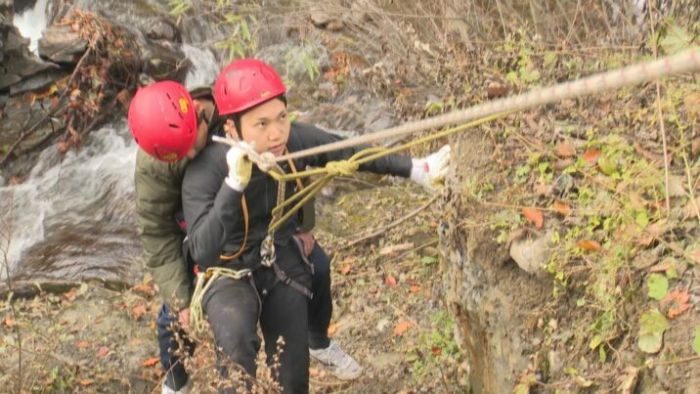 隊員は初めに崖の上の木にロープを括り付けて、2人の隊員が崖の下にいるけが人のもとへ降ります。この後崖の下の登山者を背負い、上にいる隊員がロープを使って2人を引きあげました。