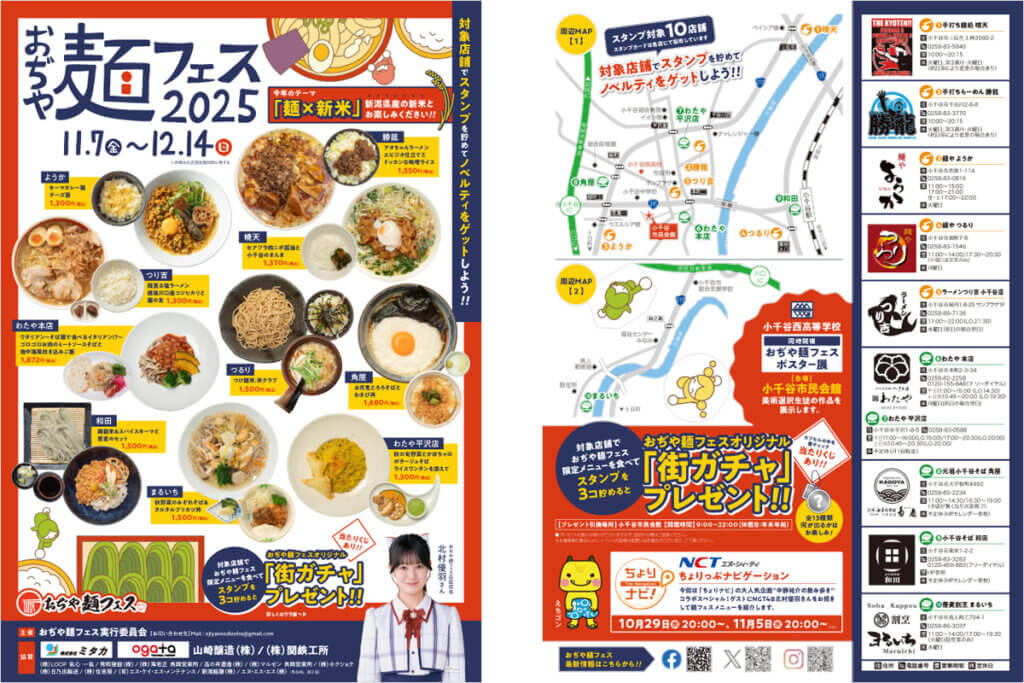 小千谷市のそば店とラーメン店で開催される恒例の麺フェス。今年のテーマは「麺×新米」。県産の新米を使ったご飯メニューと麺の欲張りなセットや、ライスワンタンを添えた麺料理など、市内10店舗が趣向を凝らした麺メニューを提供します。スタンプラリーなどもありますので、ぜひ食べ歩きを楽しみましょう。