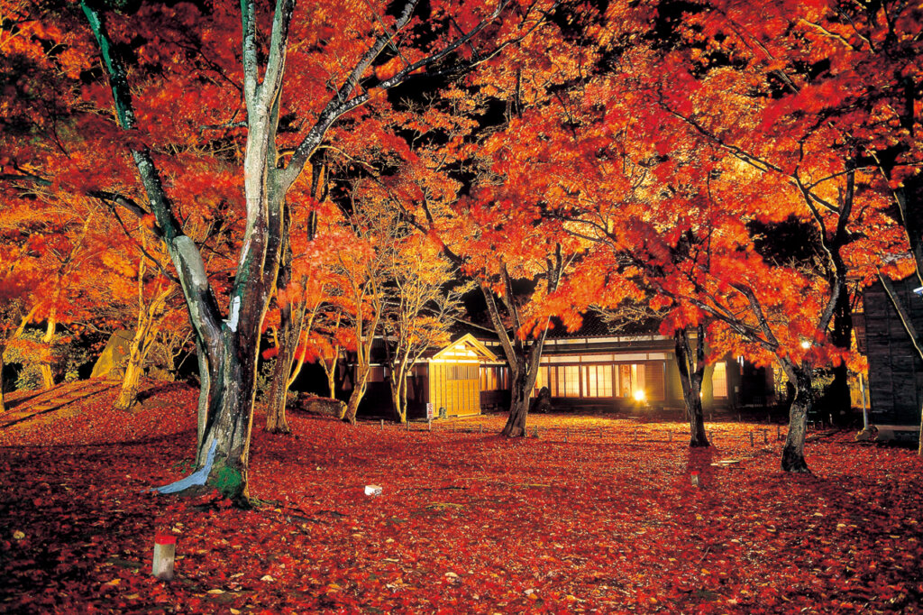 紅葉名所として名高く、毎年多くの観光客が訪れる松雲山荘。夜はライトアップされたモミジが夜空に深紅のトンネルを描き、まるで別世界のような優美な情景に出会えます。今年は週末限定(11/15・16、22・23)で、庭園の一部に和傘を設置。新しいフォトスポットに出会えます。