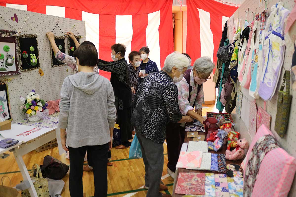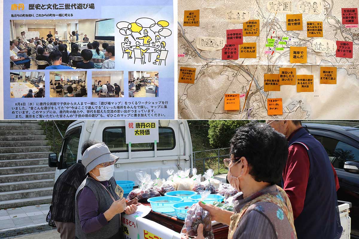 会場では唐丹公民館まつりも同時開催された。同館などで活動する15の自主グループの紹介、手芸などの作品展示、日本女子大学生と住民が行ったワークショップ「唐丹 三世代の遊び場」の展示などがあり、来場者が地域活動への理解を深めた。産直や地元農家の販売、キッチンカーの出店も。