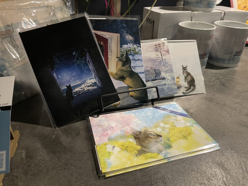 猫の写真を幻想的なアートに昇華させた「星密灯ノ猫」シリーズが、アンティーク調の店内にぴったりです。