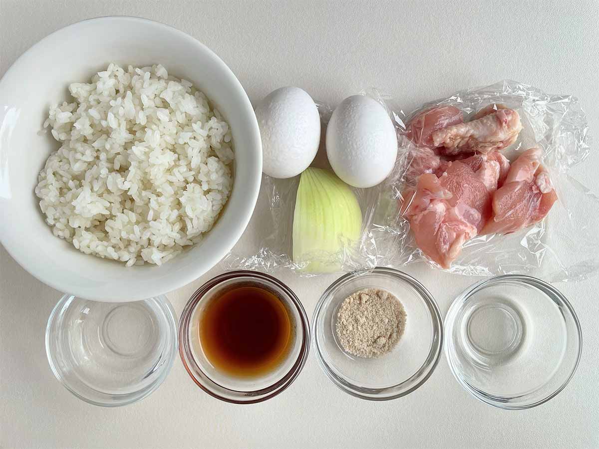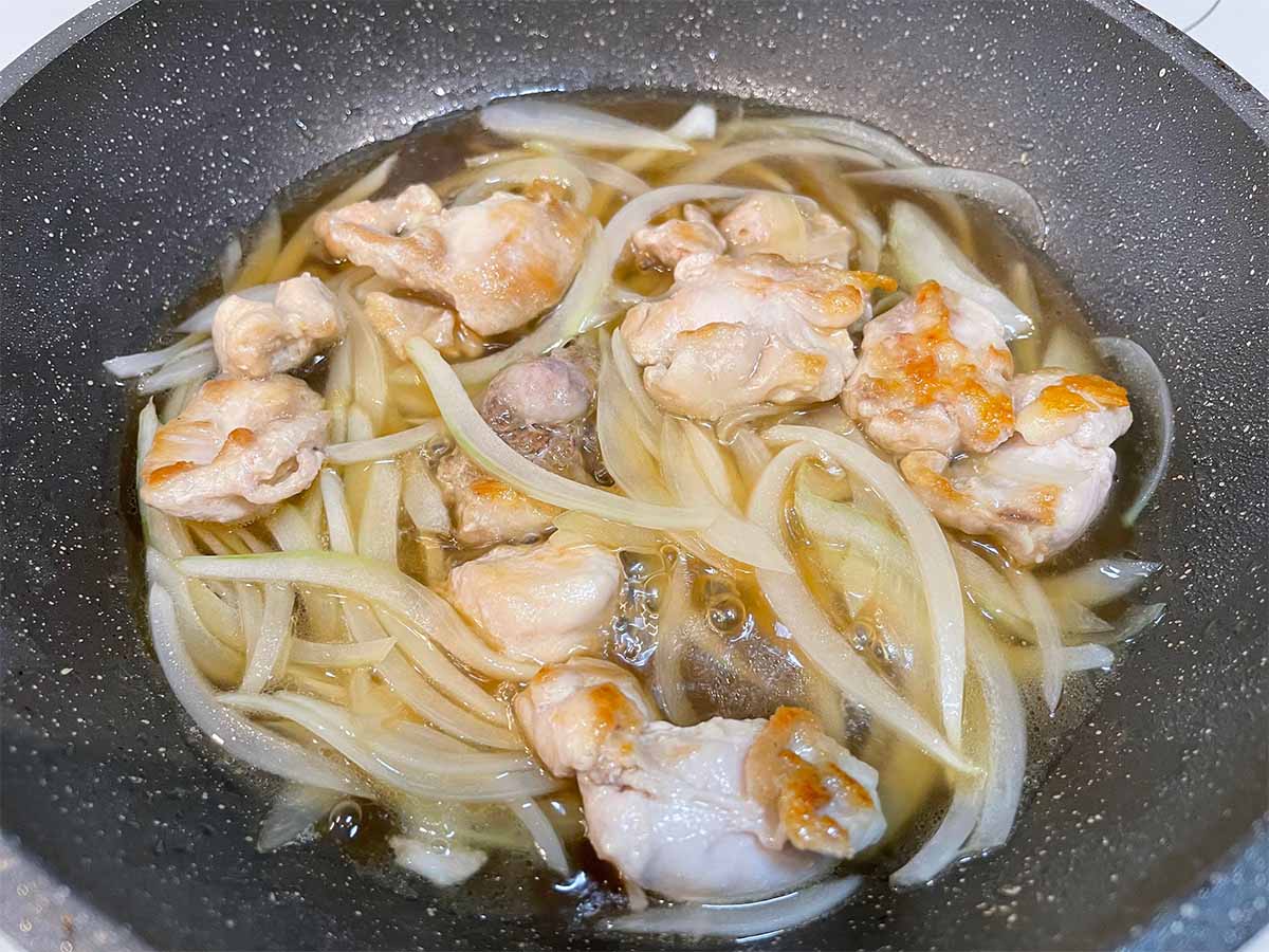 ①玉ねぎは薄切り、鶏もも肉はキッチンバサミで小さめにカット、卵は溶きほぐしておきます。