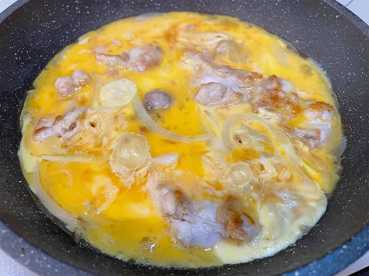 ⑤残りの卵液を加え、蓋をせずに好みの半熟状になるまで加熱します。