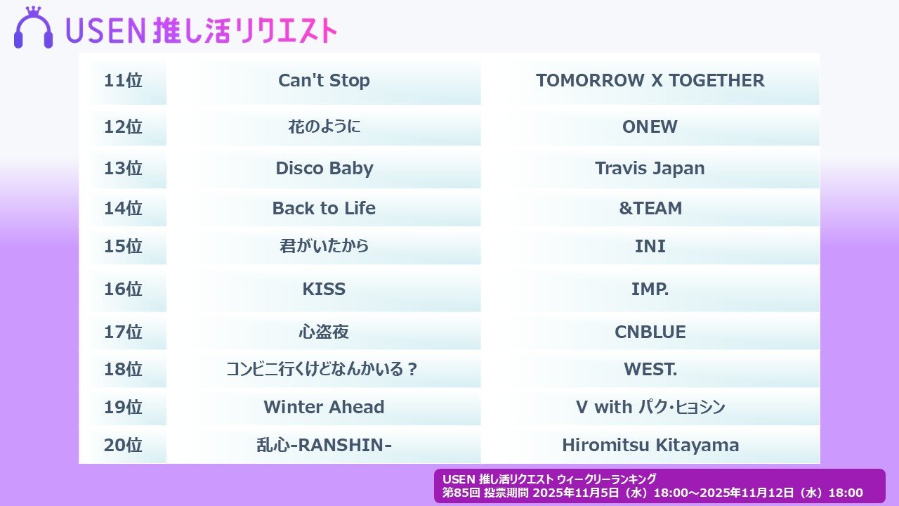 株式会社 U-NEXT HOLDINGSのグループ会社である株式会社 USENが運営する USEN 音楽配信サービスにおいて、だれでも参加できる楽曲投票サービス『USEN 推し活リクエスト』(以下、推しリク)における楽曲リクエスト(投票)をもとに 2025年 11月5日(水)より集計した『USEN 推し活リクエストランキング』の第85回「ウィークリーランキング」を発表。2025年11月15日(土)よりウィークリーランキング番組の配信が開始となる。