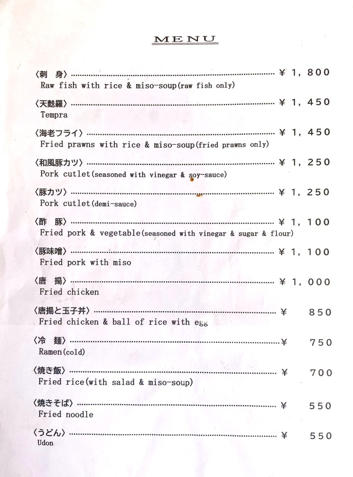 天ぷら定食や焼肉定食などの定食類のほか、カツ丼や天丼、カレーや焼きそば、ラーメンなど大衆メニューがずらりと並ぶ。