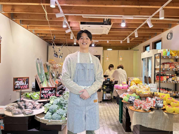 こちらが店主の奥本凌大さん。28歳の若さで、昔ながらの「人の温度」を感じられる八百屋をやりたいとこの地にやってきました。
