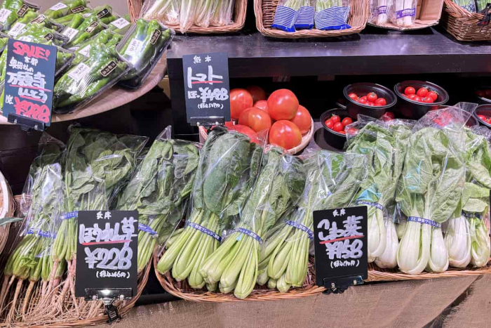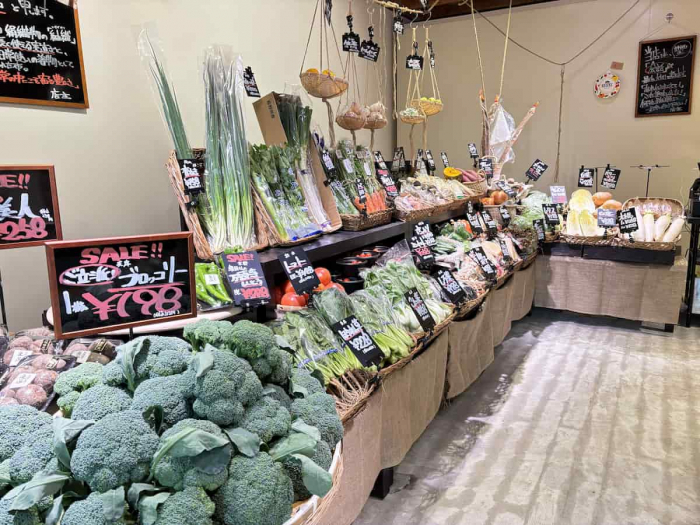 通路はベビーカーも通りやすいよう広くとってあり、その両脇に野菜を陳列。ザルで吊ったディスプレイは、なんだか海外のマルシェのよう♪