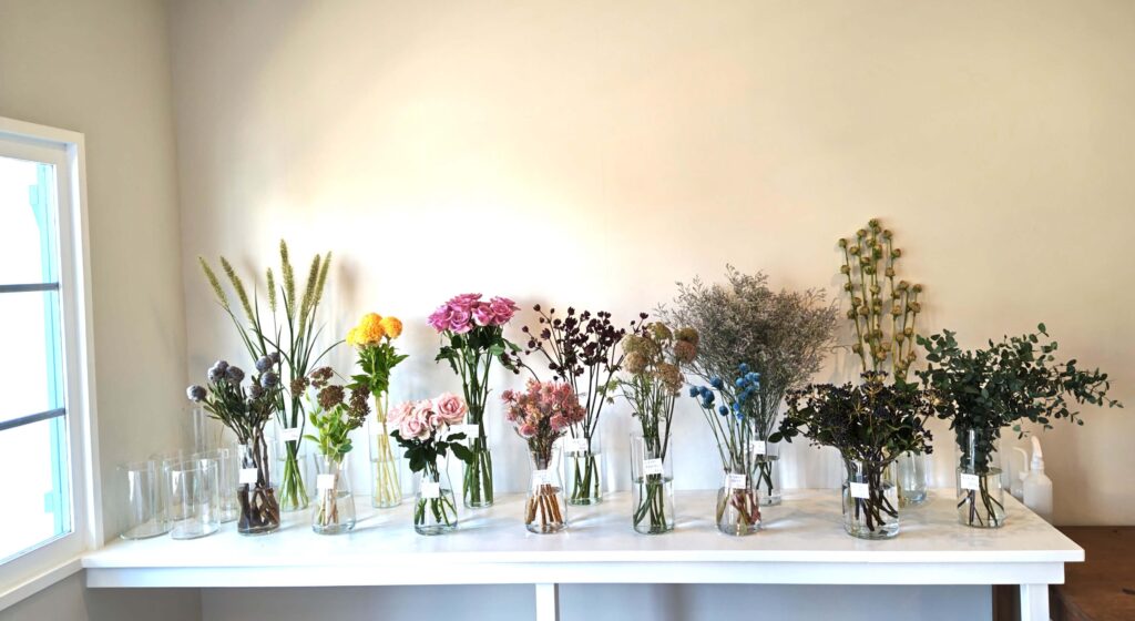 壁の白い余白と、絵画のように並ぶ花々に目を奪われます。