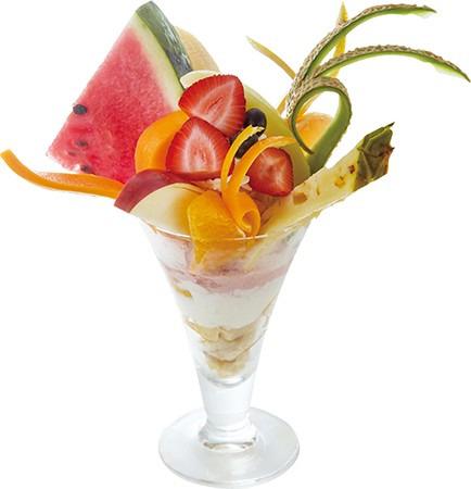 フルーツたっぷりのメニューがもりだくさんの「果実園リーベル」。りんご・スイカ・キウイ・マンゴーなど、約10種類のフルーツをふんだんにトッピングした「フルーツパフェ」が人気です。季節のフルーツシャーベットとアイスクリームも入っていて、フルーツのおいしさを味わい尽くせます。