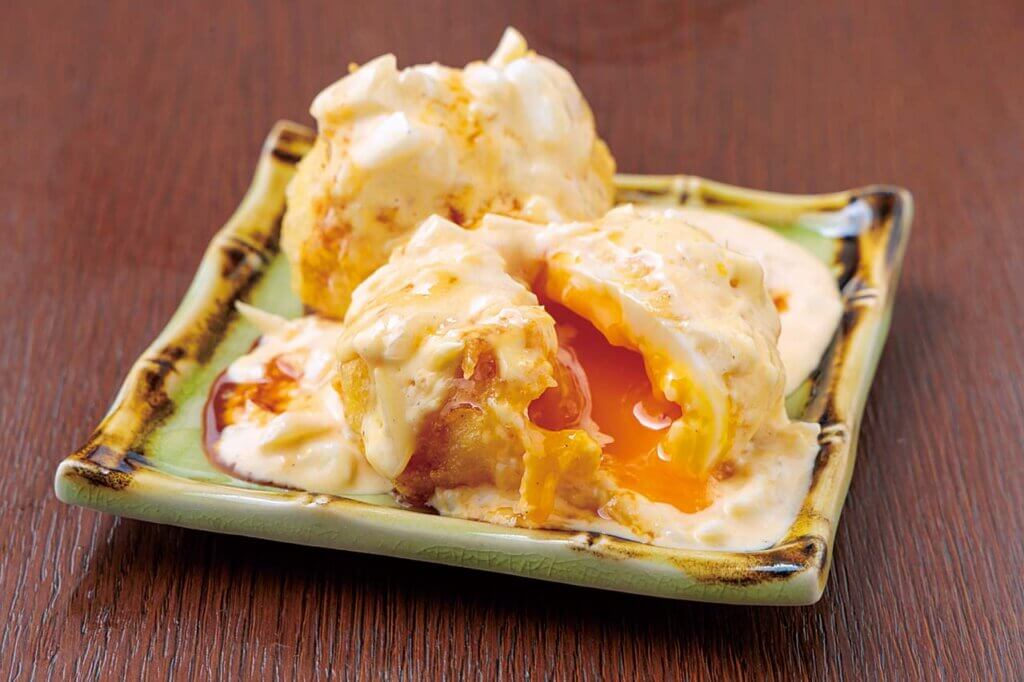 香ばしく揚げた半熟玉子のフライに、タルタルソースをかけた自家製タルタル玉子(2個369円)もおすすめです。