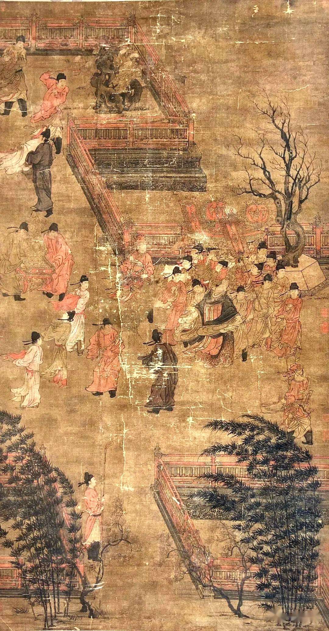 画面には27〜28人ほどの随行者が描かれ、そのうちには女官や宦官、護衛兵の姿もある。