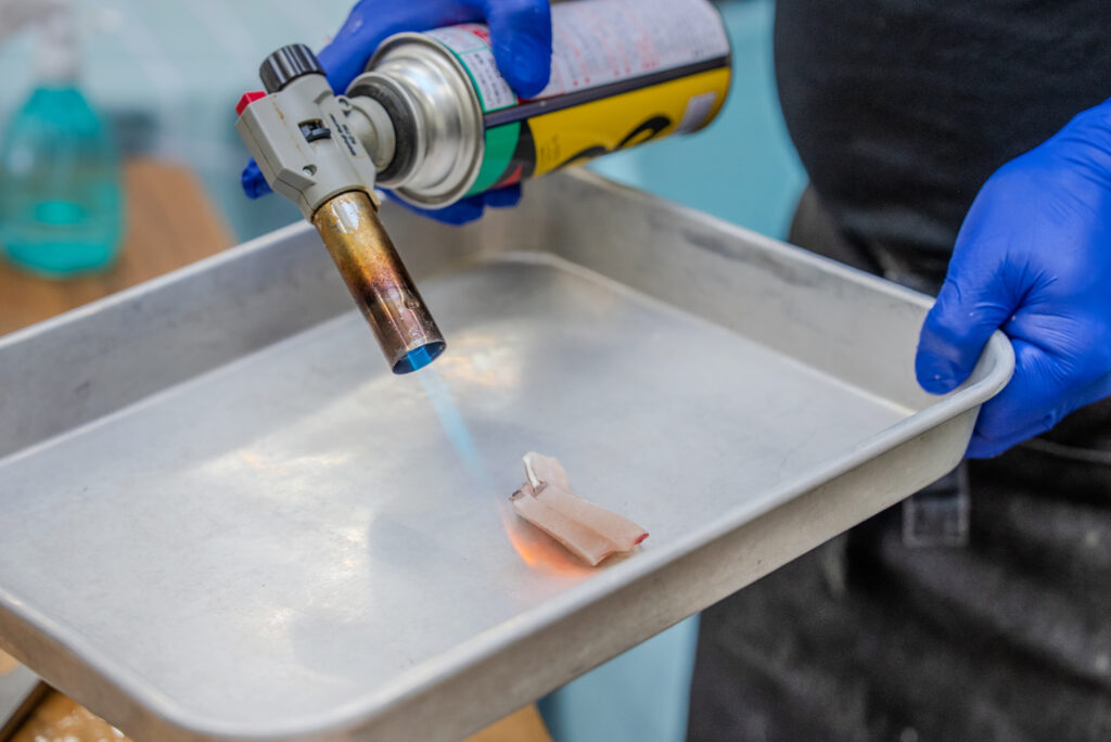 笹岡シェフ「生の刺身と比べると、炙って温めた時に身がふわっと柔らかくなりますね。皮の香ばしさもアクセントになる」