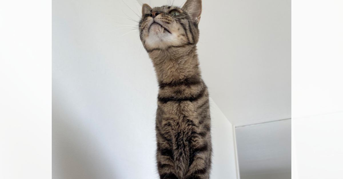 Xアカウント「CatApartment」に投稿されたのは、室内にいる一匹の猫ちゃん。上手にお座りして、上を向くようにして首を伸ばしています。