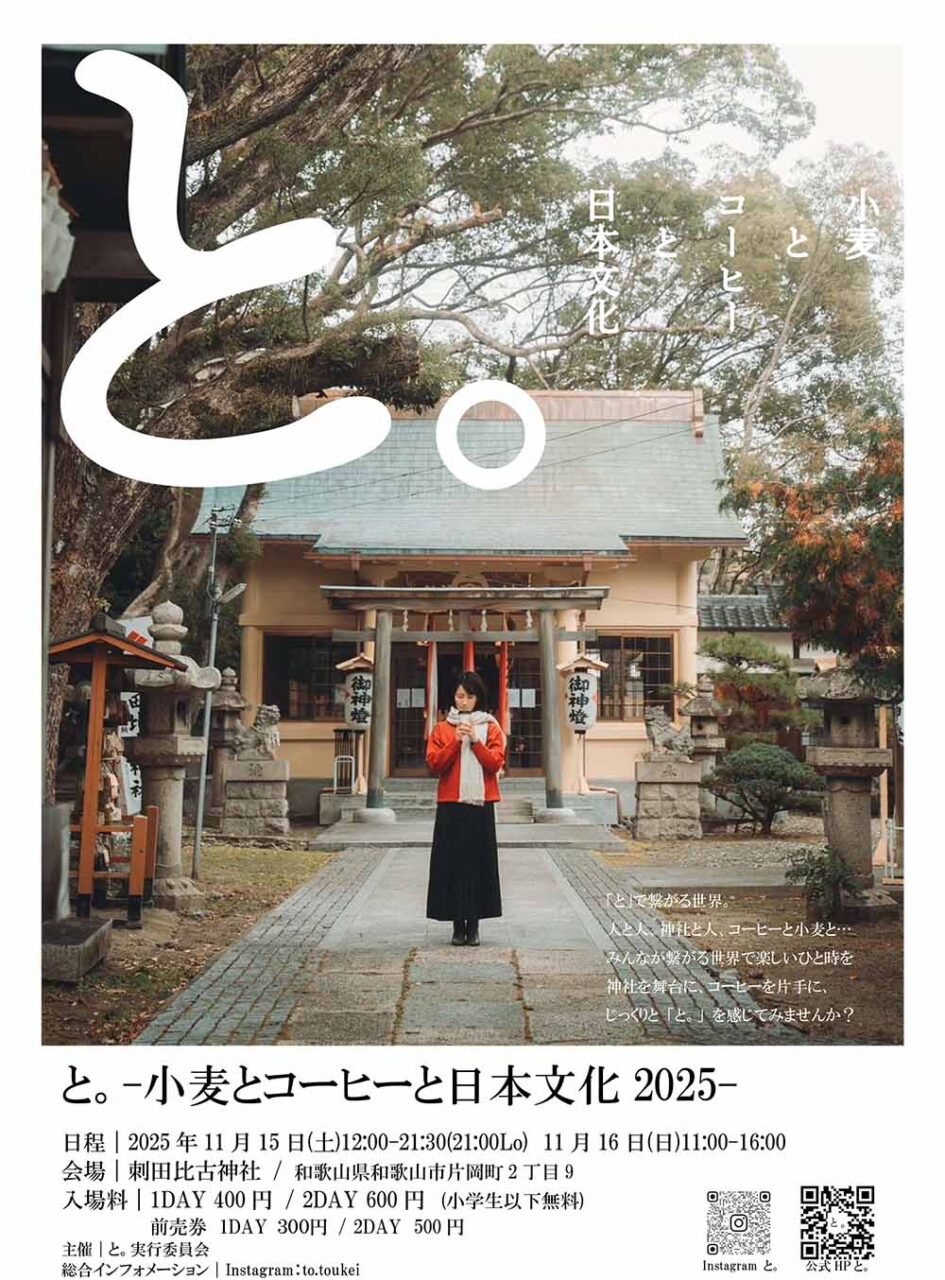 2025年11月15日(土)、16日(日)に、神社を舞台に、小麦とコーヒーと日本文化を堪能するイベント「と。」が開催。今年の開催場所は、待望の和歌山市! 会場の「刺田比古神社」(和歌山県和歌山市)は、和歌山市の中心部エリアにあるので、観光とセットで楽しむのもオススメです♪