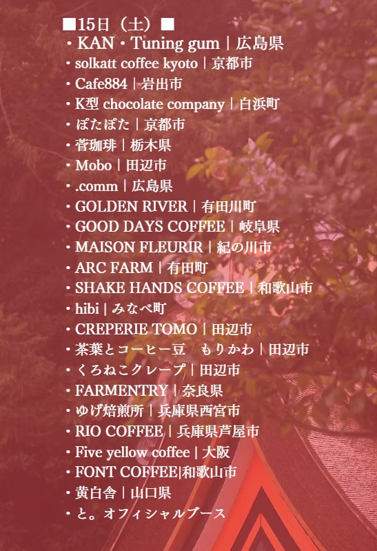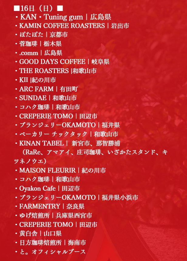 会場には、和歌山県内外のコーヒーショップやベーカリー、パティスリー、焼菓子店など、各日20店以上がずらり(9/16時点)。※最新情報は公式ホームページから確認を 広島県や兵庫県、栃木県など…、なかなか出合う機会のないお店を発見するチャンスです。
