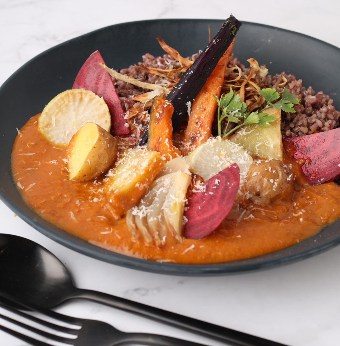 奈良県宇陀市産有機野菜を中心とした有機野菜グリルに、トマトやソイミート、たっぷりの野菜で煮込んだカレー。野菜の内容が季節によって変わるのも楽しみのひとつ。