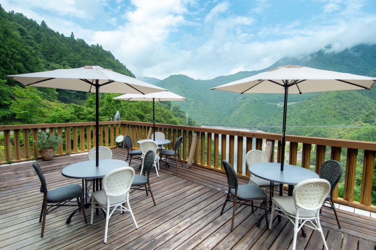 このカフェの魅力のひとつは、何と言ってもそのロケーション。テラス席からは、雄大な山々と谷瀬の吊り橋を眺めることができ、十津川村の自然を五感で感じながら食事を楽しめる。