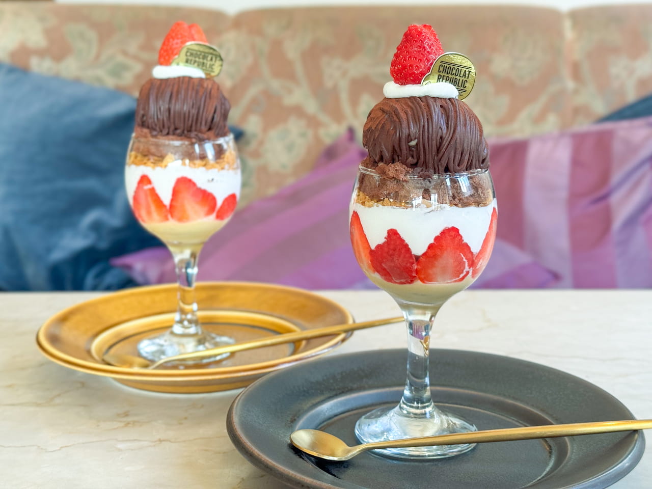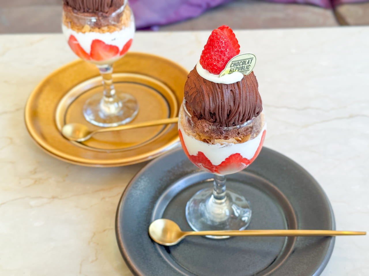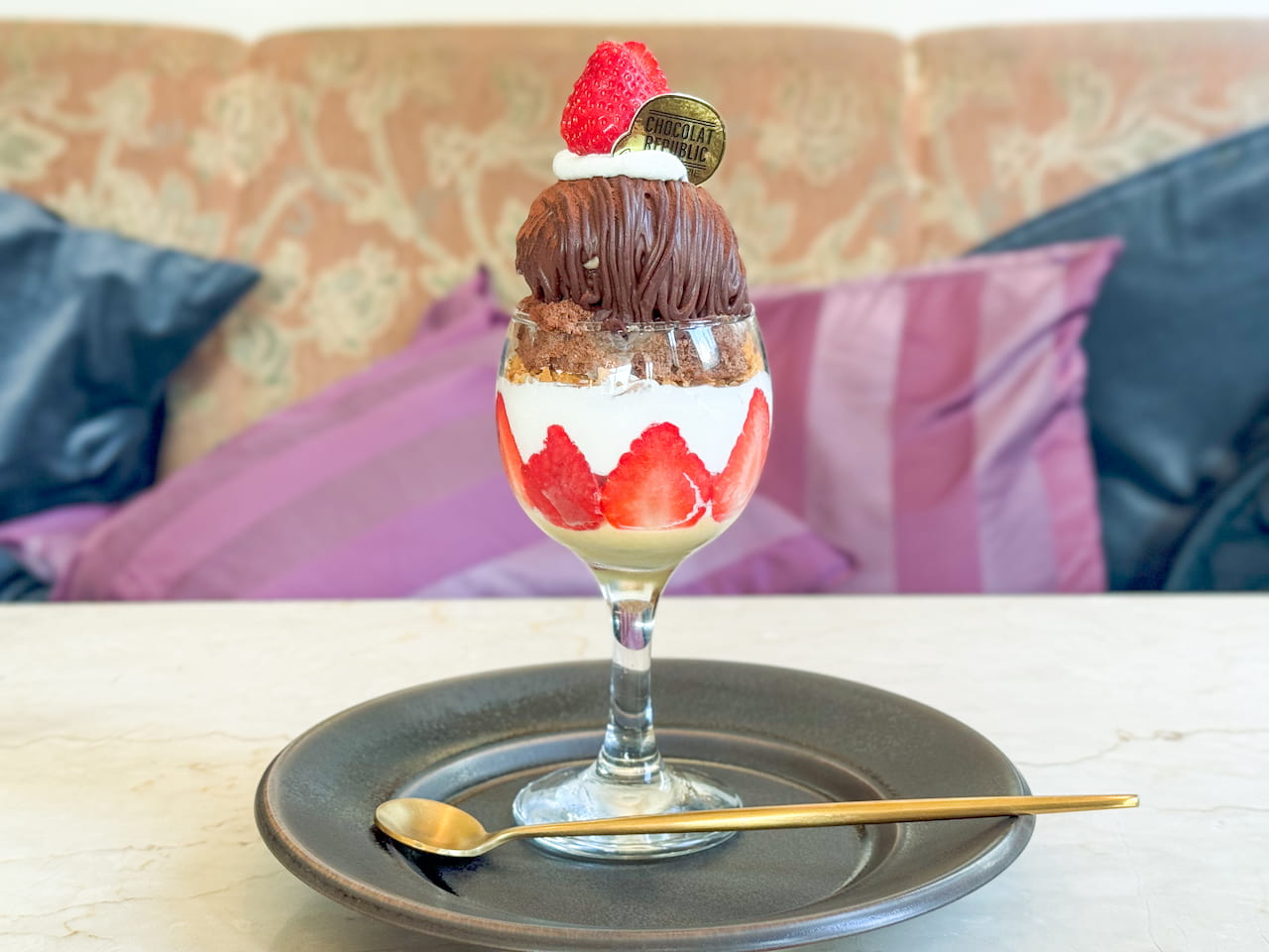 三宮本店限定でいただけるのが、「Chocolat Republic」人気No.1のケーキ「神戸生チョコモンブラン」がどどーんと丸ごと1つ乗った、とっても贅沢な「神戸生チョコモンブランパルフェ」。グラスの中にクリームやいちごがぎゅっと詰まった美しい断面にうっとり……!