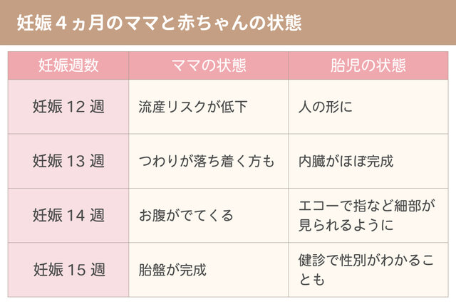 妊娠4ヵ月は、妊娠12~15週のころ。胎盤が完成し、これまで流産が起こりやすかった時期を過ぎるため、多くのママがホッと一安心できる時期です。