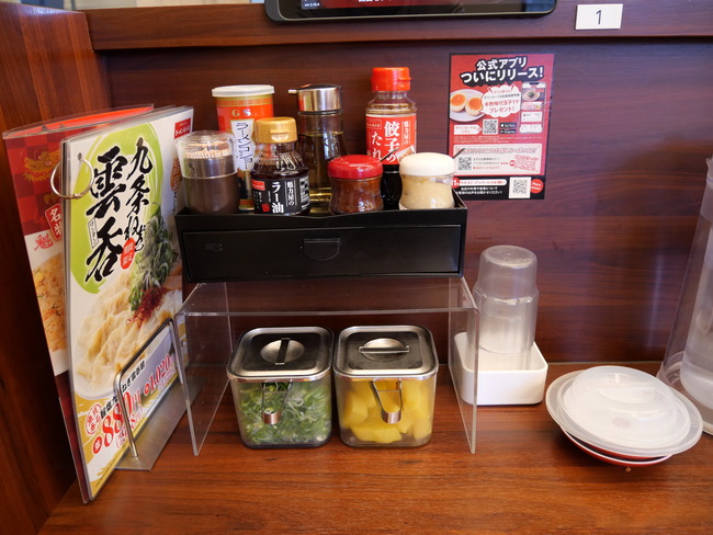 卓上には無料のたくあんとねぎが置かれており、たっぷりのせて楽しむ人も多いそう。さらに、胡椒やにんにく、ラー油など味変アイテムも勢ぞろい。気分に合わせて少しずつ加えると、また違ったおいしさに出会えます。