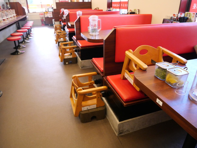 各テーブルには机にしっかり固定できるベビーチェアが用意されていて、子どもも安心して座れます。親子でゆったりと食事の時間を楽しめるのはもちろん、長椅子は幅が広く、ベビーチェアを置いてもゆったり座れるつくりです。