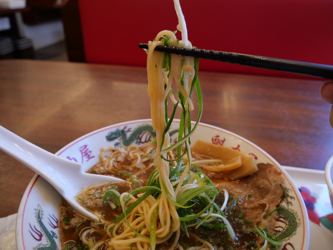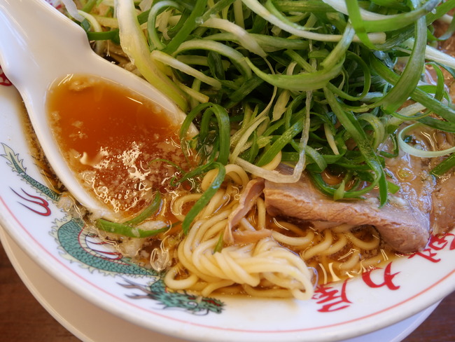 いただいてみると、あっさりとした醤油スープに背脂のコクが加わり、シャキシャキとした九条ねぎの苦みが絶妙なアクセントに。麺は中細のストレートで、スープがしみ込んだ薄切りチャーシューも食べやすく仕上がっています。