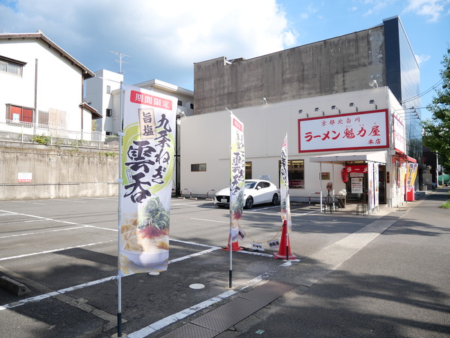 叡山電鉄・修学院駅から徒歩約5分の『京都北白川ラーメン魁力屋 本店』。白川通を北上すると、赤い看板と白い箱形の大きな建物が目印です。店舗前に駐車場があり、ファミリーカーでも来やすいのも嬉しいポイント。