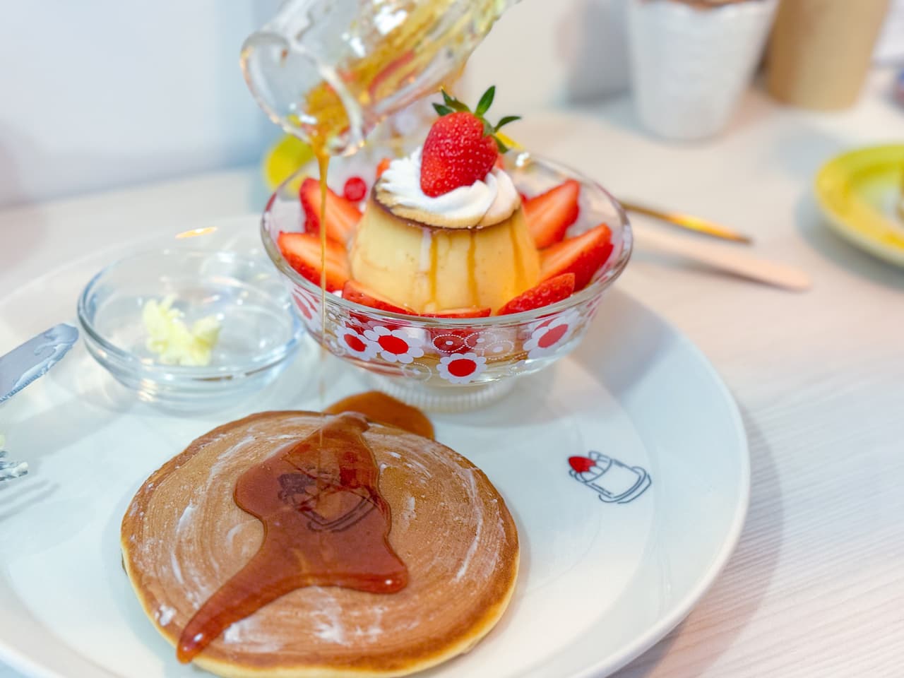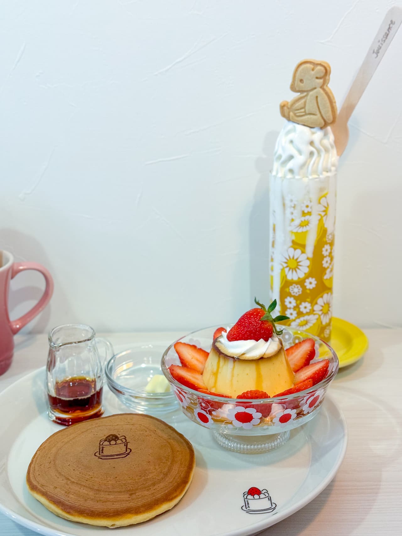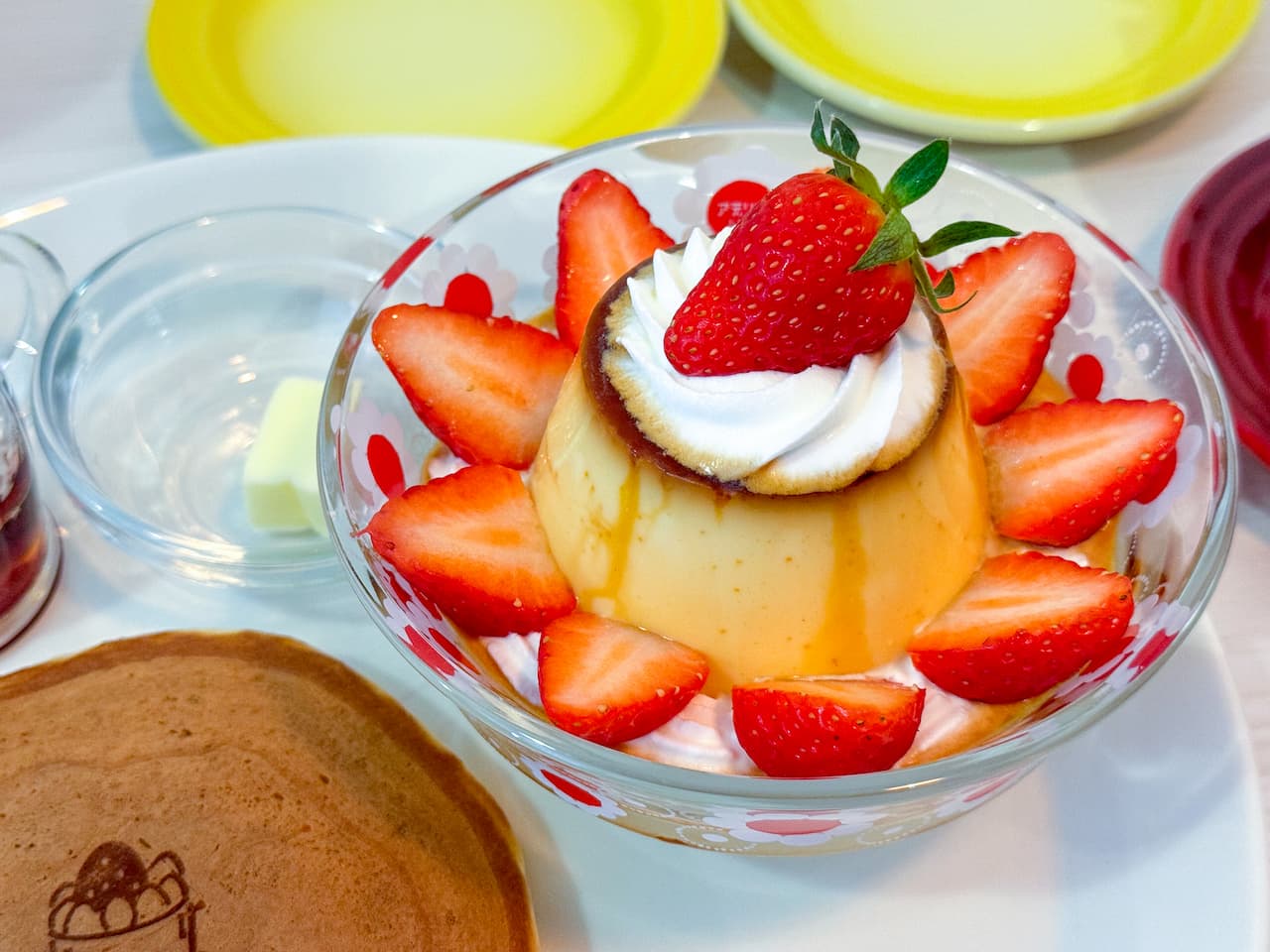 今回注文したのは、お店のロゴマークの焼き印がかわいい昔懐かしい形のホットケーキとプリンがセットになった「プリンホットケーキ」。+500円で「いちごプリン」に変更できるとのことで、果物の中でいちごが一番好きな私は、迷わず「いちごプリン」を選びました!