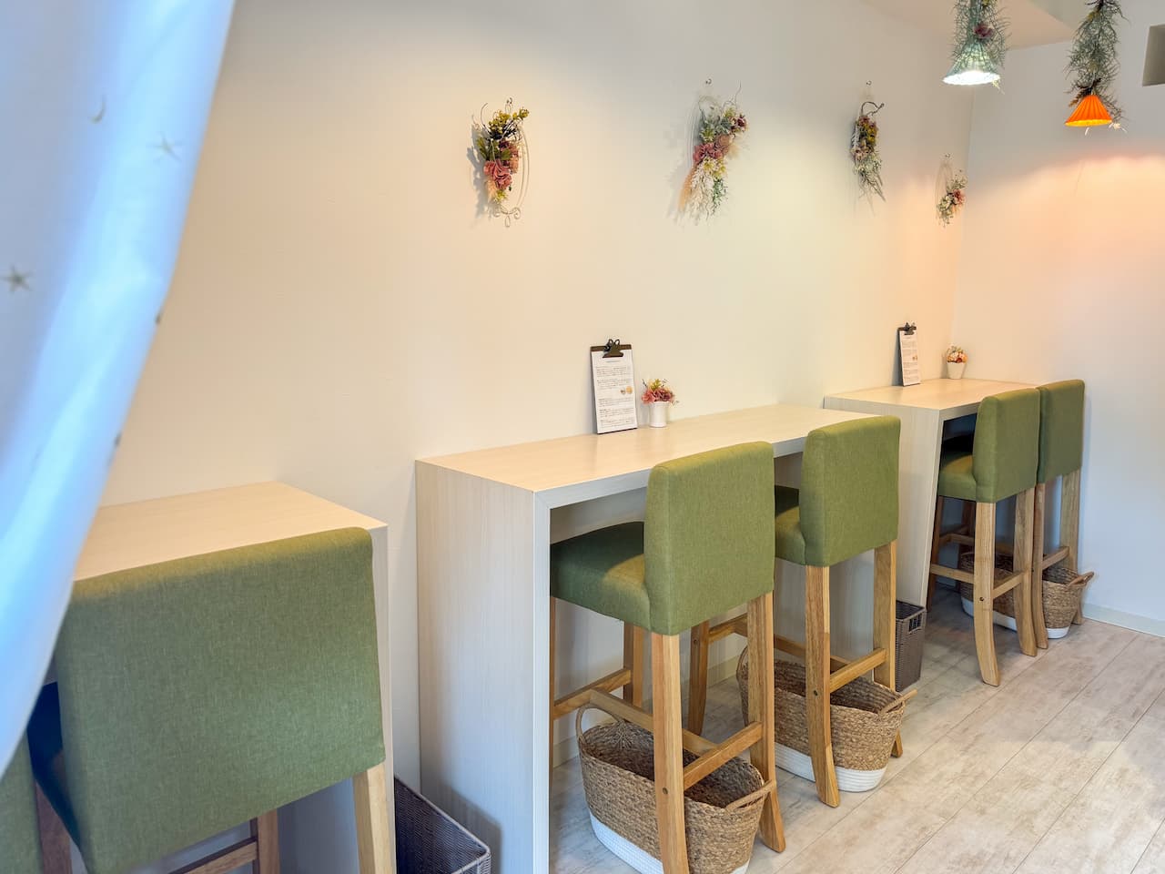 テーブル席、テラス席、半個室席があり、どの席も1〜2名で落ち着いて過ごせるつくり。また、店内にはたくさんの絵本が用意されており、注文した商品が出来上がるまでは絵本を読みながらゆっくりと過ごすことができます。