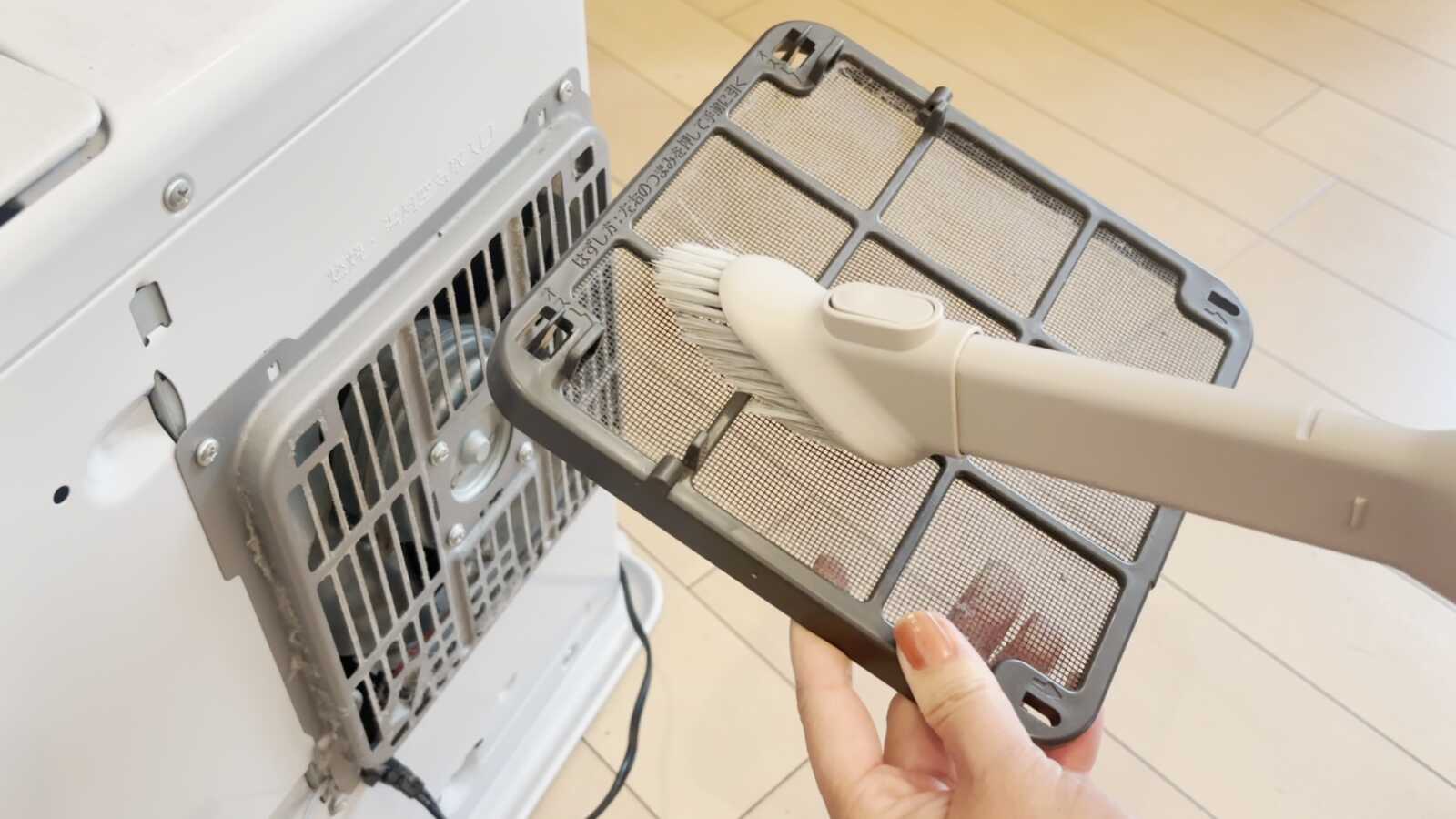 背面フィルターを取り外し、フィルター表面から掃除機でサッと吸い取りましょう。表側は特に汚れがたまりやすいので、最初のひと吸いで見た目が大きく変わります。