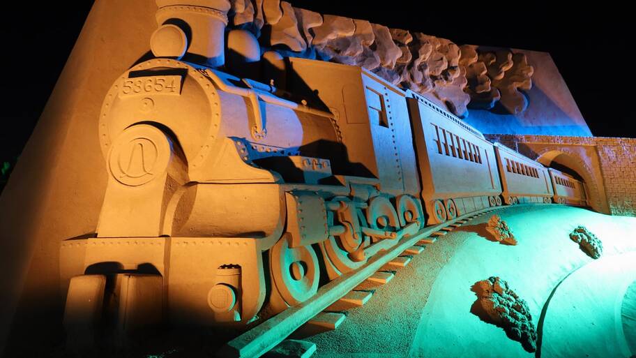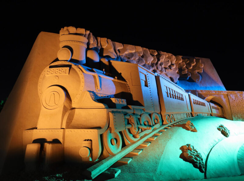 18時頃以降、毎日ライトアップされ幻想的な砂像を楽しめるほか、音と光のショーが平日は19時・20時の2回行われます。