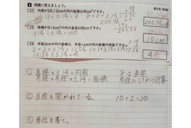 この答案のケアレスミスポイントは、半径8cmの円の面積を求めた際、÷2をして半円の面積を出していないことに気づかずに、次の計算をしてしまっていることです。子どもは、求め方がわかっていても、計算することに夢中になると、第一段階の式を解き切ったことに満足して次の計算を忘れてしまうことがあります。