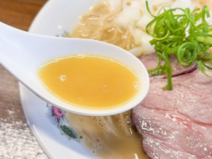 なめらかな口当たり、濃密な味わいはさながらポタージュのよう。しかし後味は雑味やしつこさを感じない軽やかさもあり「クリアな濃厚白湯」というイメージ。