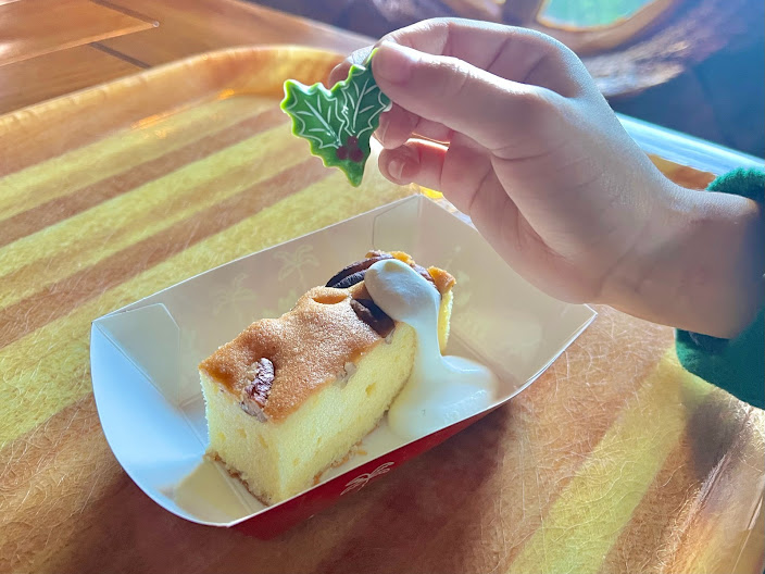 「ピーカンナッツのケーキ」には、ヒイラギの葉を模したチョコレートも付いてきます。コーヒーブレイクのお供にもおすすめのデザートなので、親子でホッとひと息つける食事タイムが過ごせそうですね。