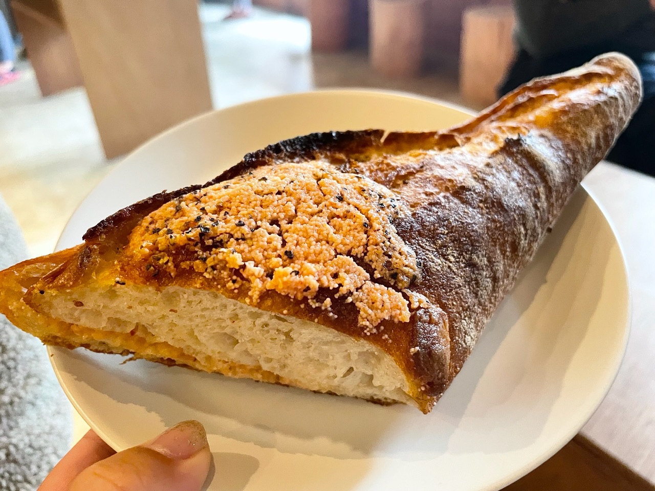 人気パンは、購入制限がかかるほど大人気の明太フランス。焼き立ては外はパリッとハードで、中は水分を感じるモチモチトロトロの感動の食感!見た目以上に端から端まで明太子がサンドされています。焼き立てをその場で食べられたらラッキーですよ。