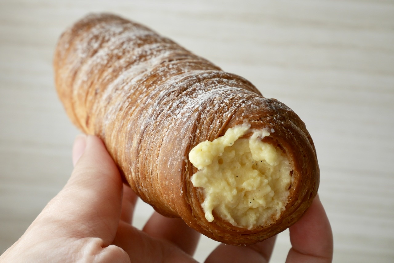 イチオシはサクサクのクローネ。筒状になったデニッシュ生地は信じられないほど軽い食感!注文後にこの空洞にたっぷりと自家製カスタードを詰めてもらえるんです。