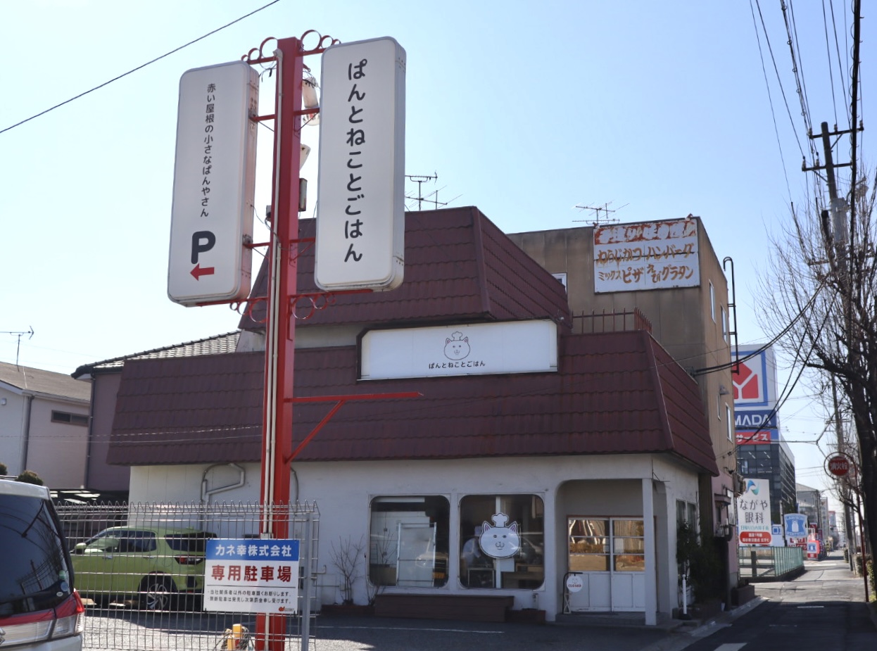 ゆるい猫のイラストと赤い屋根が目印の「ぱんとねことごはん」さん。