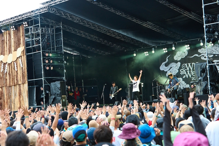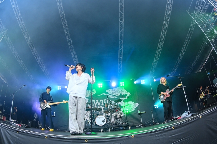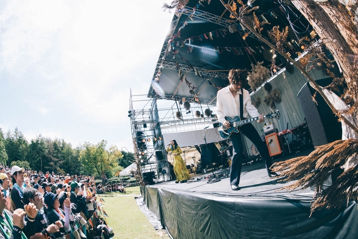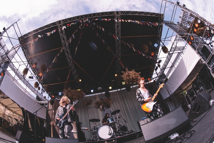 ホテルに戻ってひとっ風呂浴び、オフィシャルカメラマン氏イチ押しの岐阜タンメンのカップラーメンを食したところで記憶は途切れ、気づけば朝だった。なんとも言えない全身疲労はフェスを楽しみきっている証。ちなみに、あとで聞いたところによると深夜は豪雨だったらしいが、すっかり晴れている。2日目ももちろん午前中から会場へ向かう。ブレイク前にはこの会場でオープニングアクトを務めていたOmoinotakeがついにメインステージに立っているのはエモの極みなのだが、ここはあえてのw.o.d.。近作で感じる充実ぶりから期待値は相当高かったけれど、予想以上にキレキレでタフなライブを展開してくれた。そもそもバンドを始めたきっかけがウッドストック等の野外フェスに憧れたからという彼らはブラーも大好きとのことで、「Parklife」との相性は抜群である。