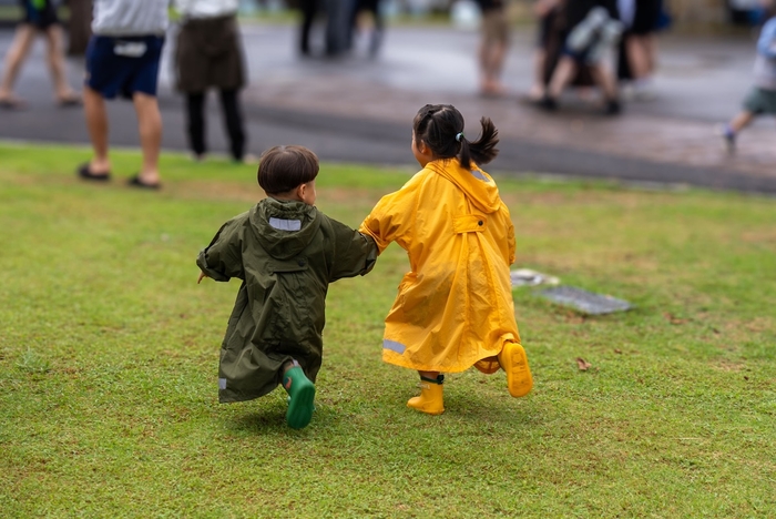 その後、水カンからグリム、チリビへとハイペースで移動しながら観て回り、いずれもすっかり晴れた秋空へと陽性のヴァイブスを放ちまくっていて最高。昼時にあらためて場内を巡ると、曇天だった1日目と比べキッズエリアが大盛況。近藤康平氏と子どもたちによるライブペインティングやビニールプールでマスを掬うブースなど、微笑ましい光景がたくさん。ついでに、腕もしくは頭から冷水をかけてもらえる、というだけの謎ブースも気温上昇に比例して繁盛している。近年、複数の夏フェスが開催時期をずらしたりするほどの酷暑問題が存在するが、そのシンプルかつユニークな対策と言えるかもしれない。