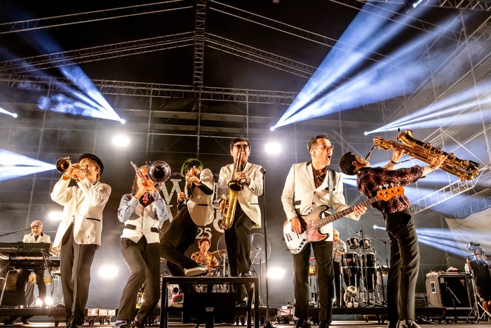 そしてここで本日最大の悩ましい裏被り事案、ナッシングスと奥田民生が全く同時刻にスタートという局面を迎えた。のんびり度随一の「Parklife」で観る奥田民生なんて極上のチルアウトが約束されているわけだが、ここはロック的ブチ上がりと個人的交友関係を優先。キラーチューン連発のセトリも良かったし、線路上への倒木の影響で会場到着が危ぶまれた一幕を明かした上で「フェス名のせいでは?」とオチをつけたMCにも笑った(不謹慎)。笑いと言えば外せないのがレキシ。個人的には久しぶりだったので、ついに光るようになった稲穂に驚きつつ、バリバリに上手い演奏によるグルーヴの洪水と数えたらキリがないほどの小ネタとアドリヴに大満足。最後はスカパラの華やかかつ盤石の演奏と、Omoinotake・藤井怜央&奥田民生&甲本ヒロト(ザ・クロマニヨンズでも普及のロックンローラーぶりにヤラれた)という豪華ゲスト陣との共演に燃え上がった。