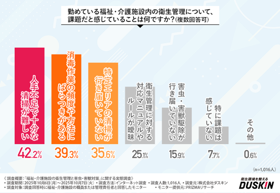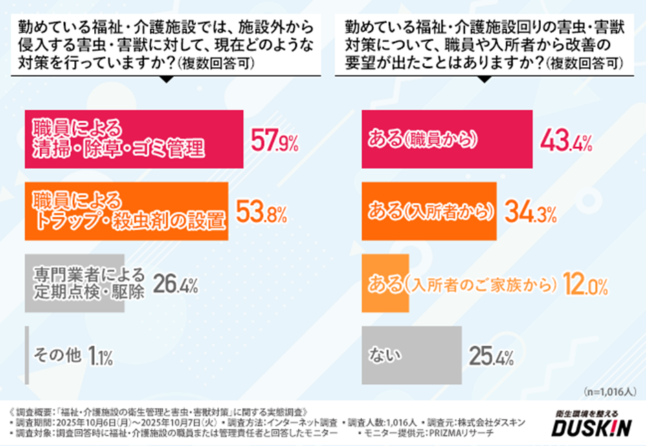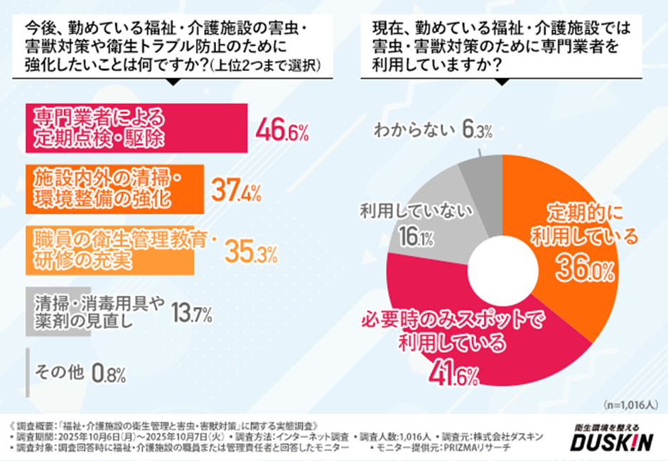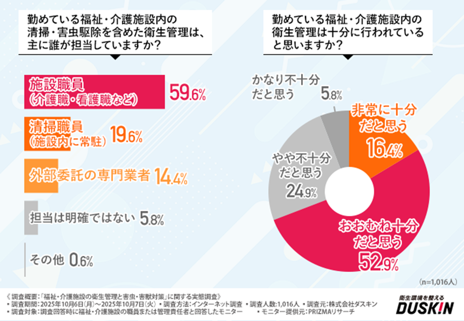 このような問題意識の下、福祉・介護施設の衛生管理と害虫・害獣対策の実態を、施設に勤める職員および管理責任者1,016人に対して調査した結果が、先ごろ公表された。今回、その調査を実施したのは、環境に配慮した害虫獣駆除と総合衛生管理サービスを展開する、ダスキン ターミニックス(https://www.duskin.jp/terminix/)。これにより、福祉・介護施設の“見えづらい衛生の現場”にどのような実態があるかが、あらためて浮き彫りとなった。
