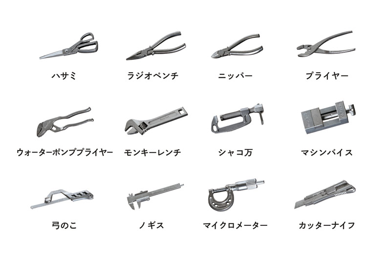 ラインナップは、「ハサミ」「ラジオペンチ」「ニッパー」「プライヤー」「ウォーターポンププライヤー」「モンキーレンチ」「シャコ万」「マシンバイス」「弓のこ」「ノギス」「マイクロメーター」「カッターナイフ」の全12種。